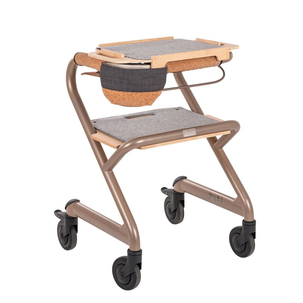 Ce déambulateur d'intérieur haut de gamme, entièrement équipé, passe presque toutes les portes grâce à sa largeur de seulement 51 cm à son point le plus étroit. Doté d'une large gamme d'accessoires, il constitue une aide polyvalente au quotidien. Il supporte tout le poids du corps sans basculer. Il comprend un siège, adapté et testé pour une utilisation même pour les déplacements à petits pas assis. Il sert non seulement de chariot de service, mais aussi de surface de rangement, de siège confortable et rembourré, de panier à linge et de support pour les toilettes.