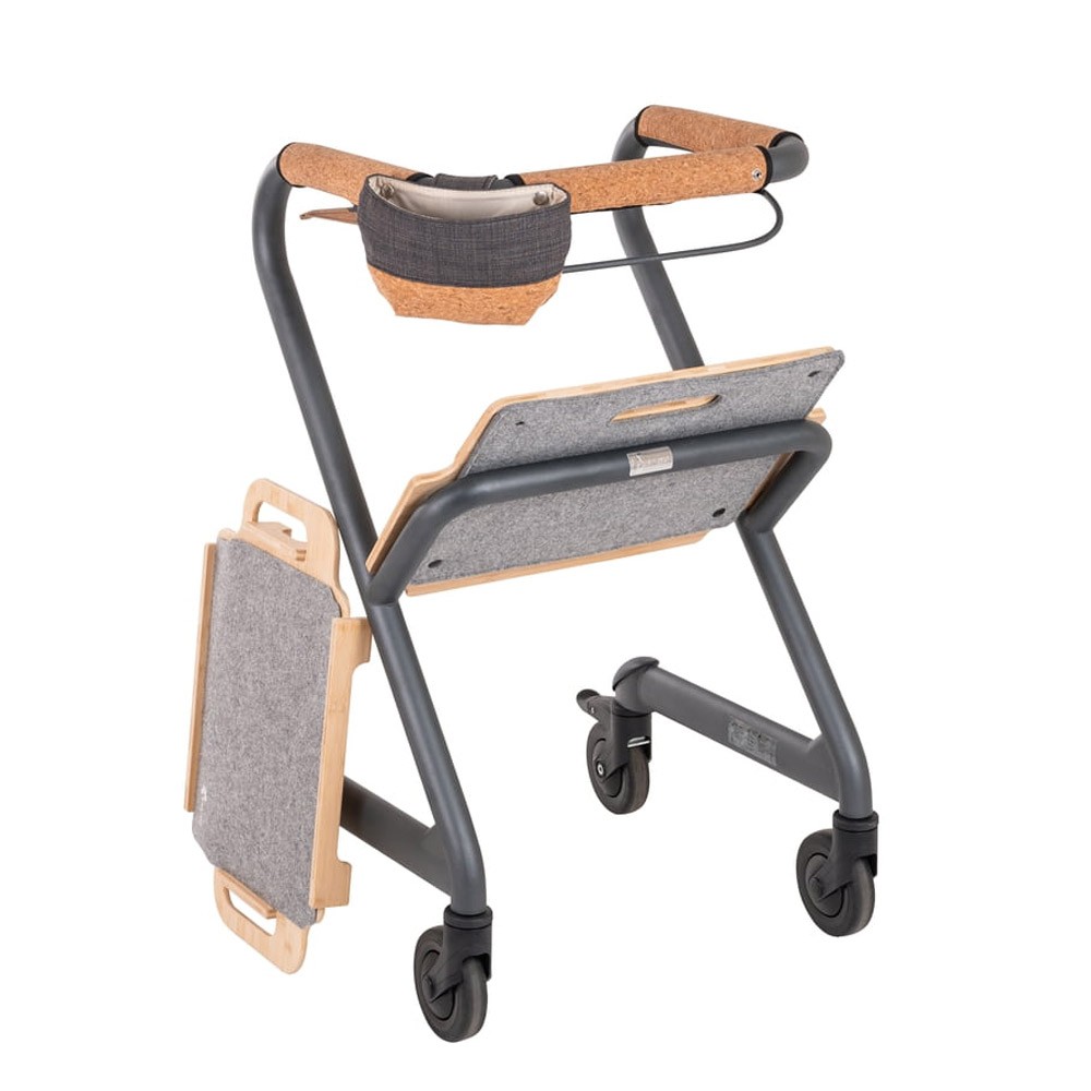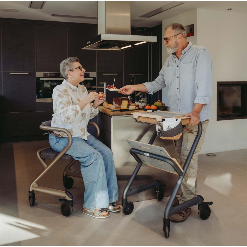 Transporter un repas complet de la cuisine à la salle à manger n'est plus un problème. Un grand plateau recouvert de feutre, pouvant supporter jusqu'à 20 kg, est désormais inclus avec le déambulateur d'intérieur entièrement équipé. Astuce: Disposez le siège et le plateau en forme de V sur la marche inférieure ; vous pourrez ainsi transporter du linge, des livres et même du bois de chauffage.