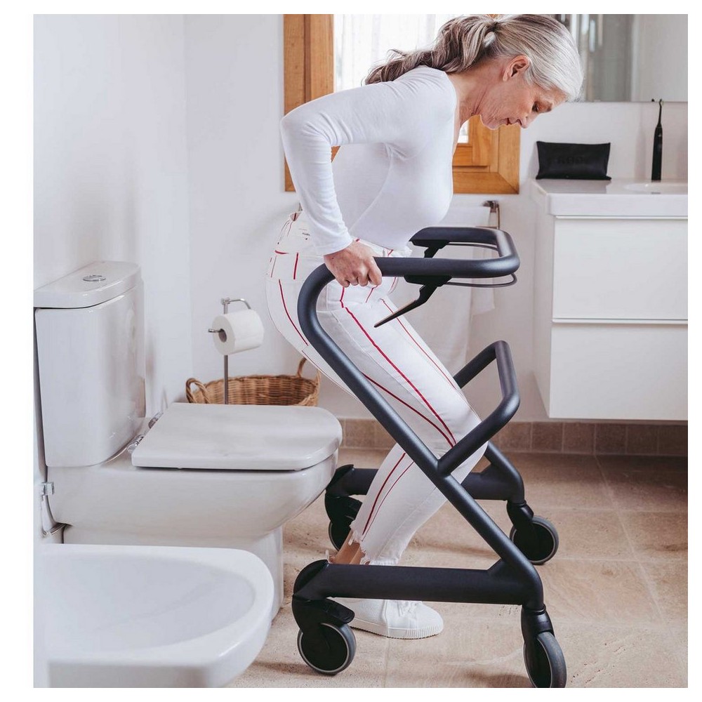 Avec le frein de stationnement serré, il suffit de s'appuyer sur le déambulateur pour s'asseoir et se lever. Cela peut éviter d'installer des barres d'appui murales ou même de rénover entièrement la salle de bain.